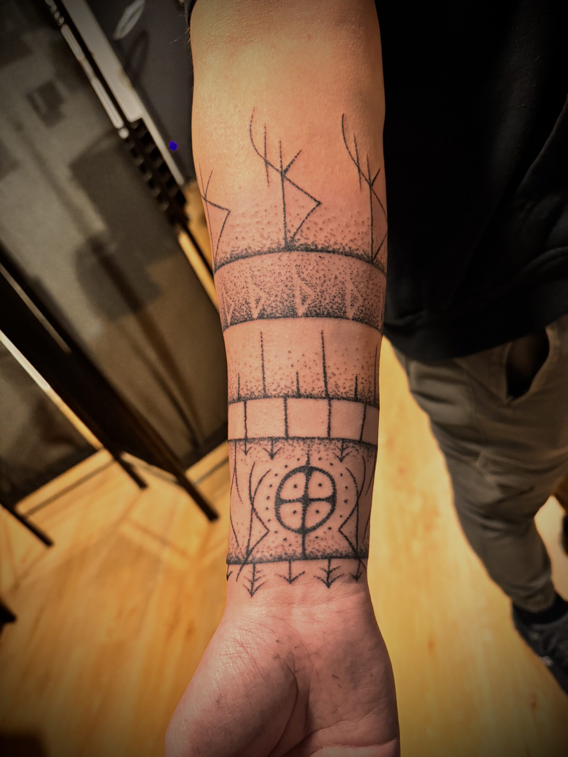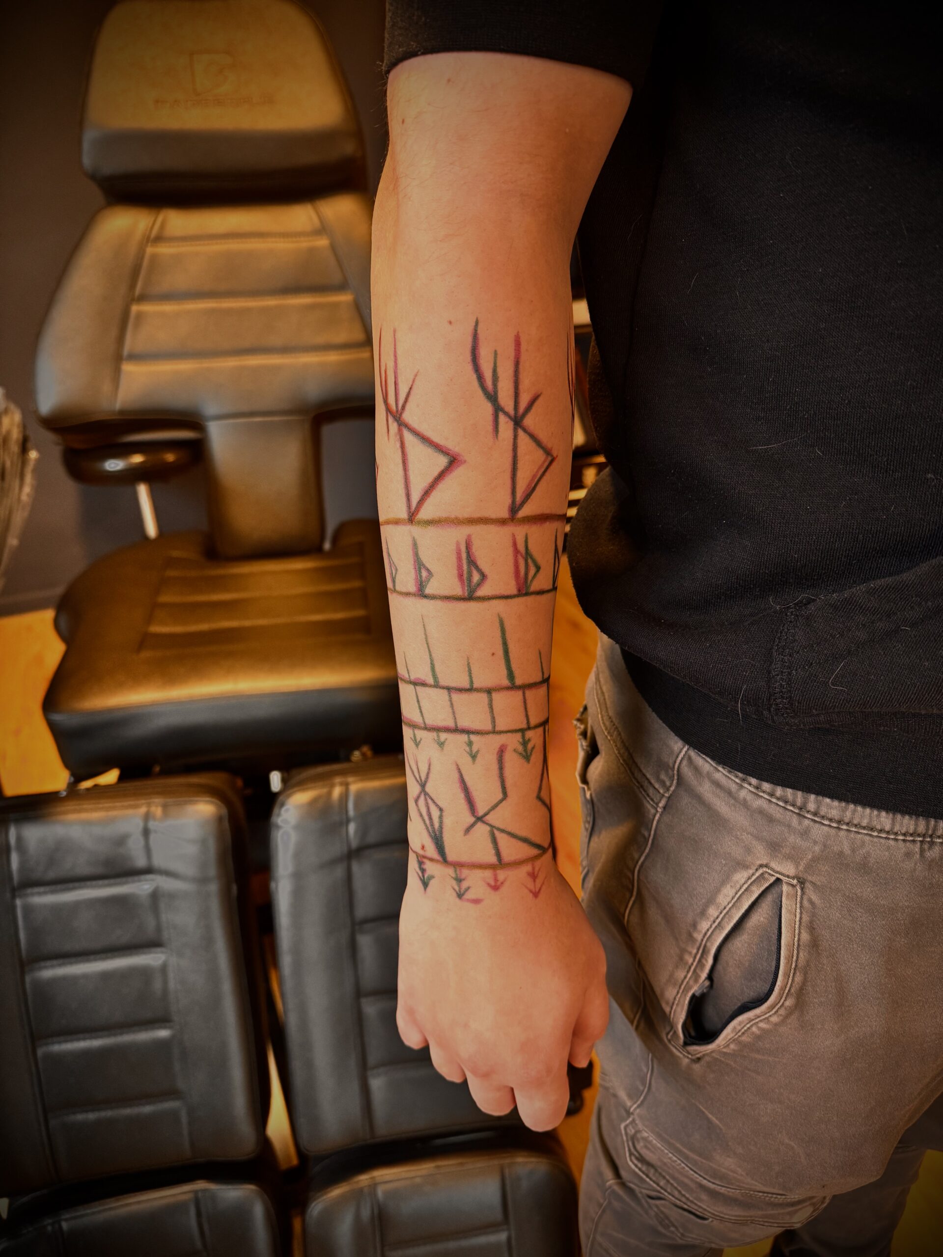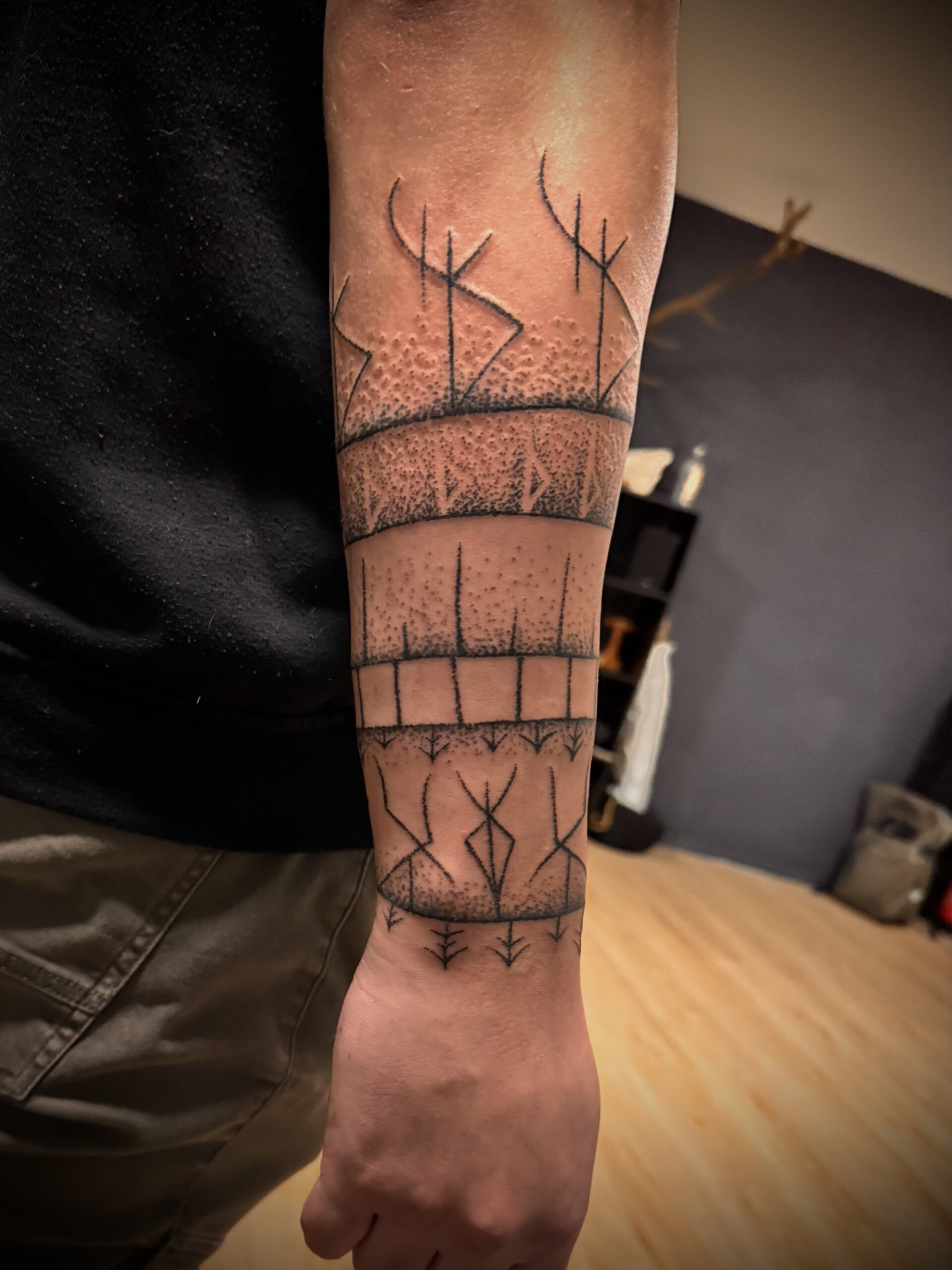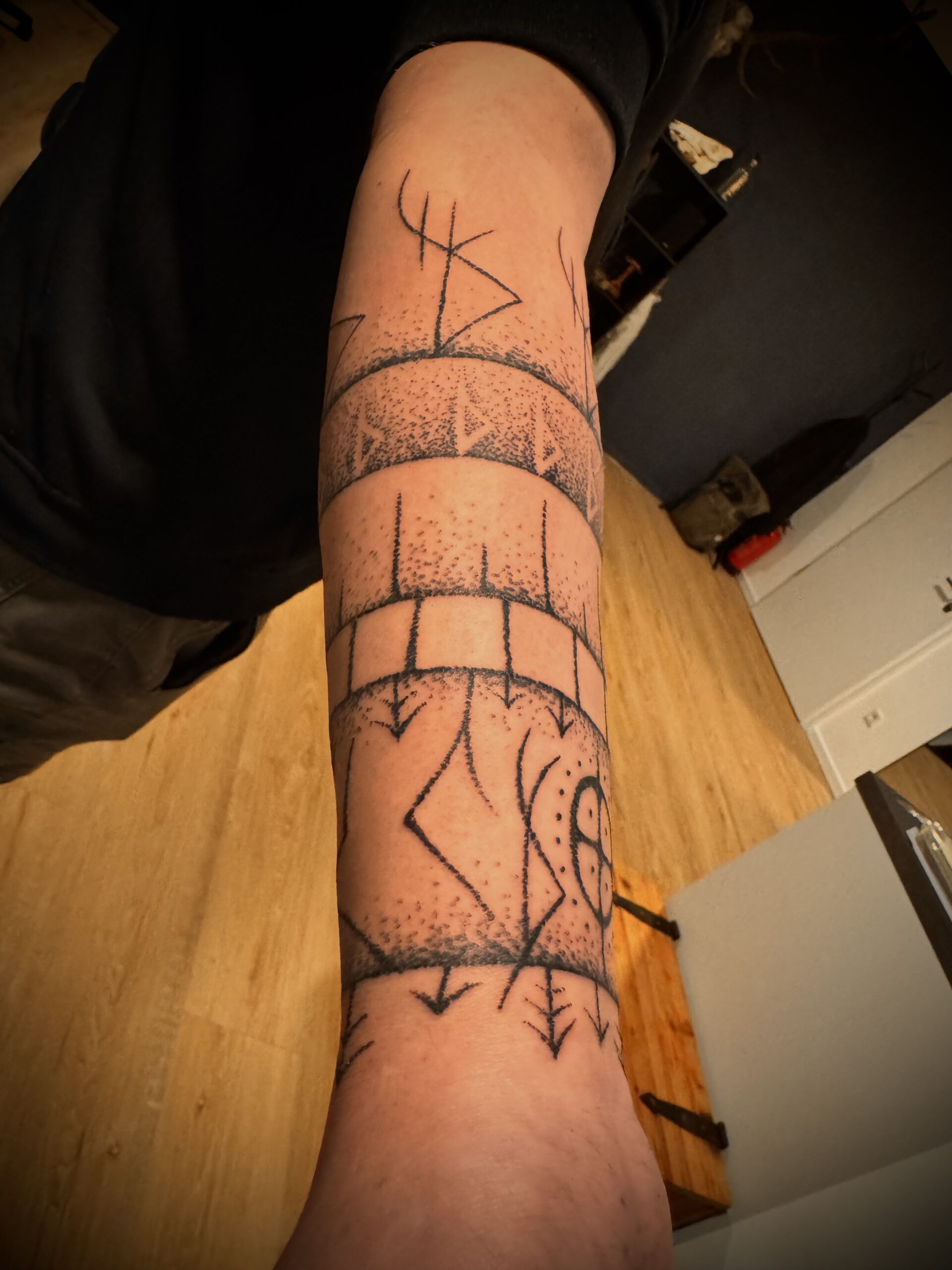 Ein Tattoo auf dem Unterarm, gedacht als schützende Rüstung aus Zeichen und Bedeutung. Die Runen folgen der Form des Arms , sie stehen für Schutz, Standhaftigkeit und die bewusste Entscheidung, den eigenen Weg mit Klarheit und Kraft zu gehen.