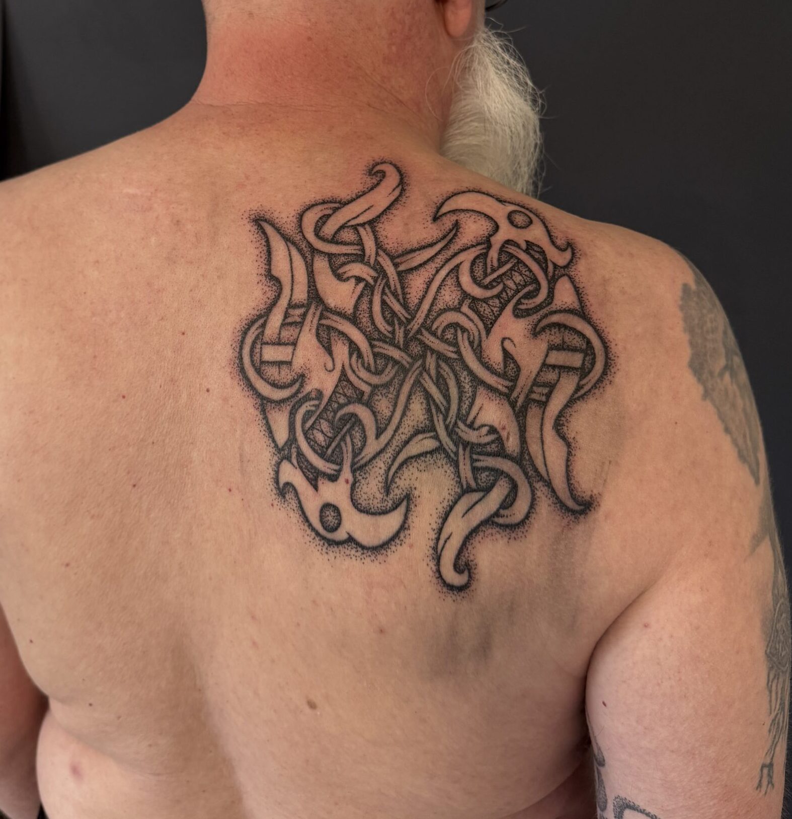 Dieses Tattoo zeigt Hugin und Munin, Odins Raben, die die Welt durchstreifen und Wissen sowie Erinnerungen für den Allvater sammeln. Im Jelling-Stil umgesetzt, es verbinden Knotenmuster und historische Ornamente zu einem kraftvollen, nordischen Design.