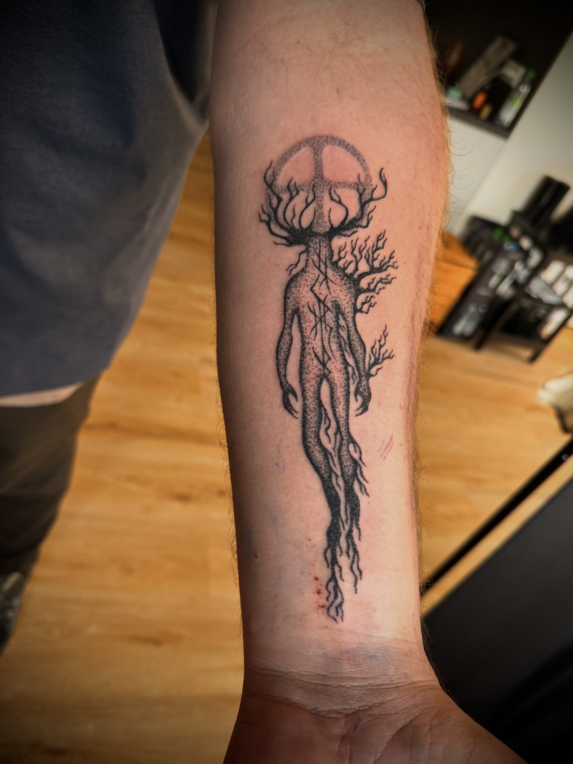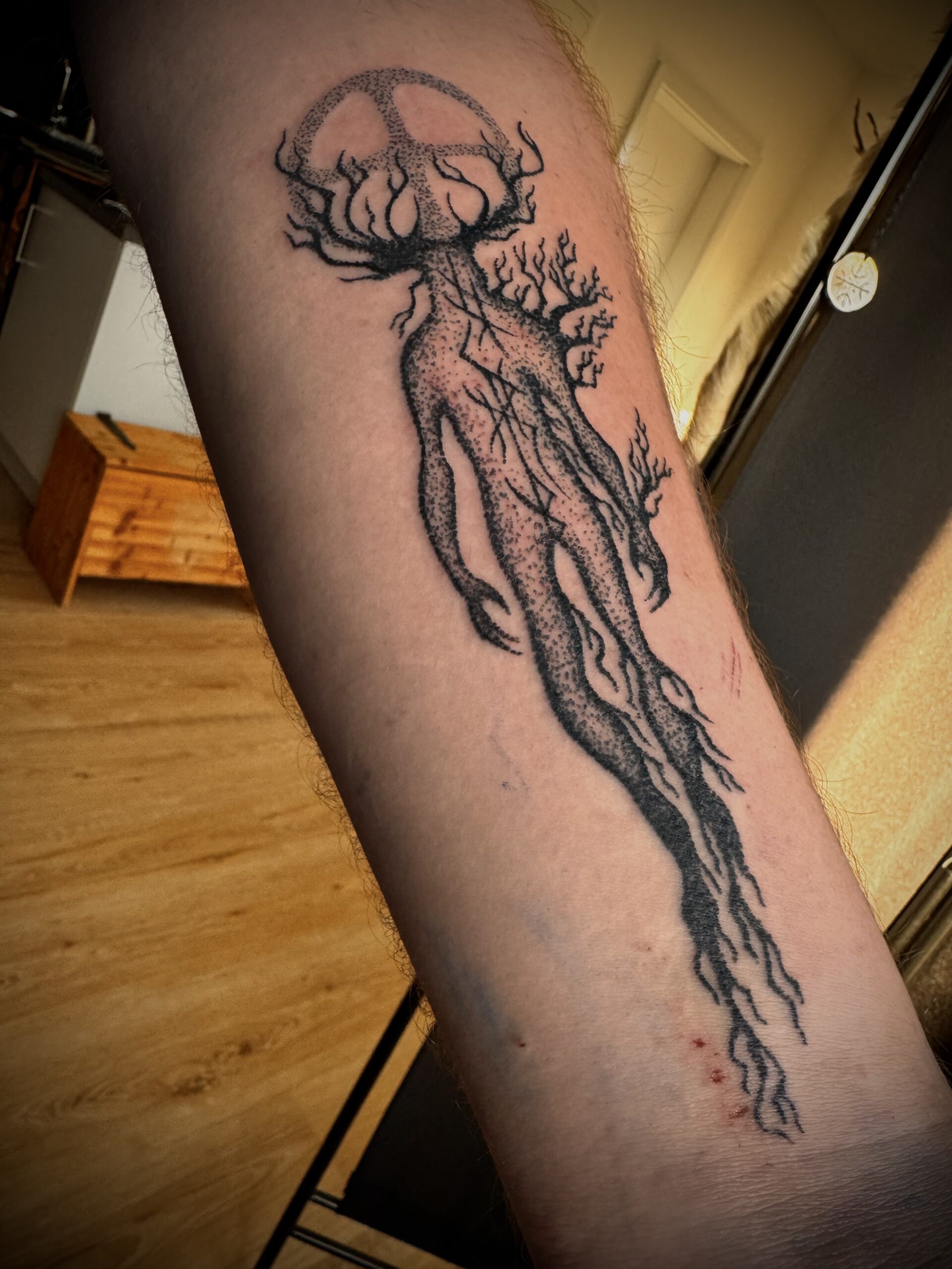 In diesem Tattoo verbindet er sich mit Bindrunen, die wie in die Haut des Wesens eingewebt sind: Zeichen von Schutz, Stärke und Erinnerung an alte Pfade.